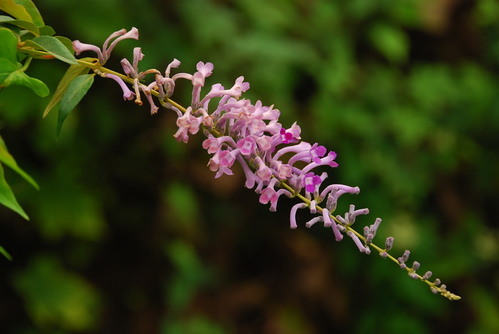 醉鱼草古田山 1. 学名:Buddleja lindleyana Fort. 2. 科名:马钱科Loganiaceae 3. 别名:闭鱼花、痒见消、野刚子 4. 特征:落叶灌木,高达2m。小枝四棱形,有窄翅。叶对生;叶片卵形至长圆状披针形,先端尖,基部楔形,全缘或具稀疏锯齿。穗状花序顶生,花偏向一侧;花淡紫色,花冠筒细长管状,微弯曲,顶端4裂,外面具白色光亮细鳞片。蒴果长圆形。花期6~9月,果期10月。 5. 分布:产于全省低山丘陵及平原;分布于华东、华中、华南、西南及陕西。 6. 生境:生于向阳山坡灌丛、溪边或石缝间。 7. 园林用途:花序穗状,花密色艳,优良花灌木,可供花境或湿地美化,亦可作切花。 8. 繁殖方式:播种、扦插繁殖。 绢毛马铃苣苔